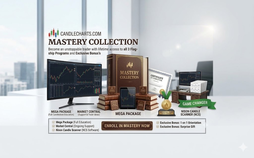 While you will have full access to the Candlecharts Mastery Collection on any internet enabled device.  Access Mega Package, Market Central, and Nison