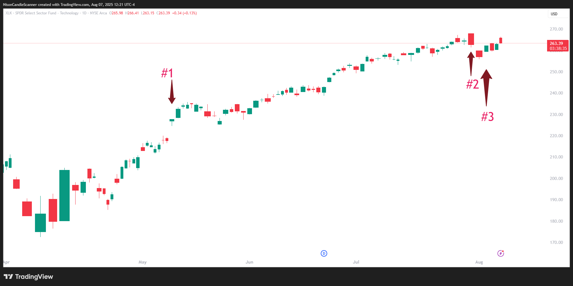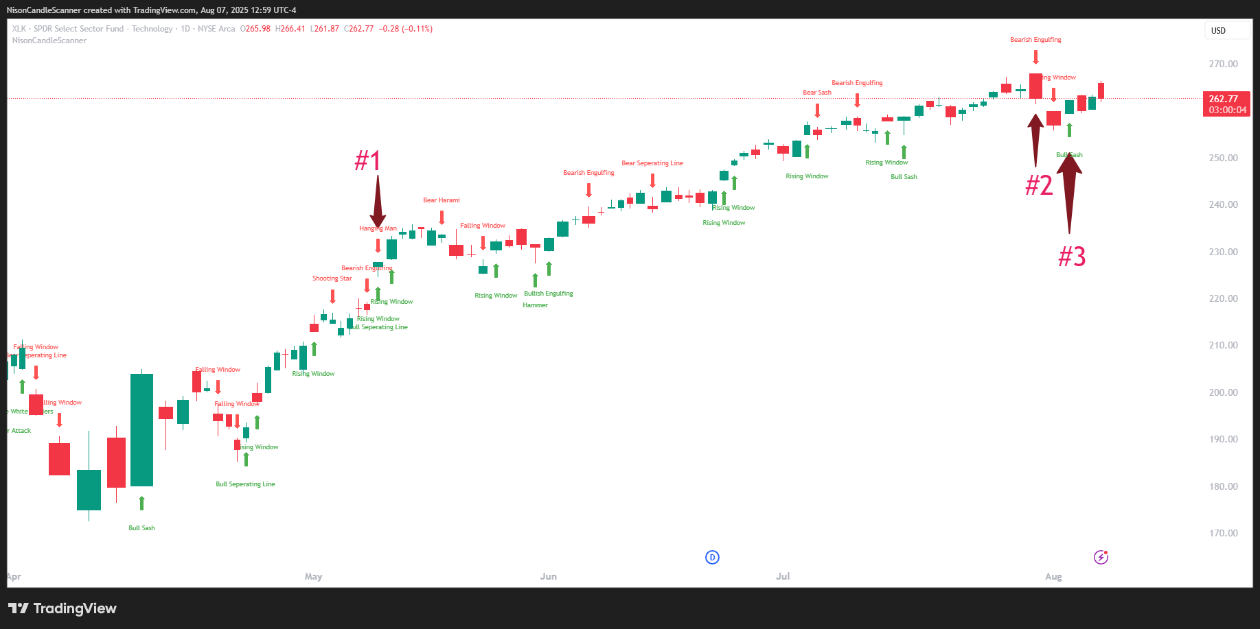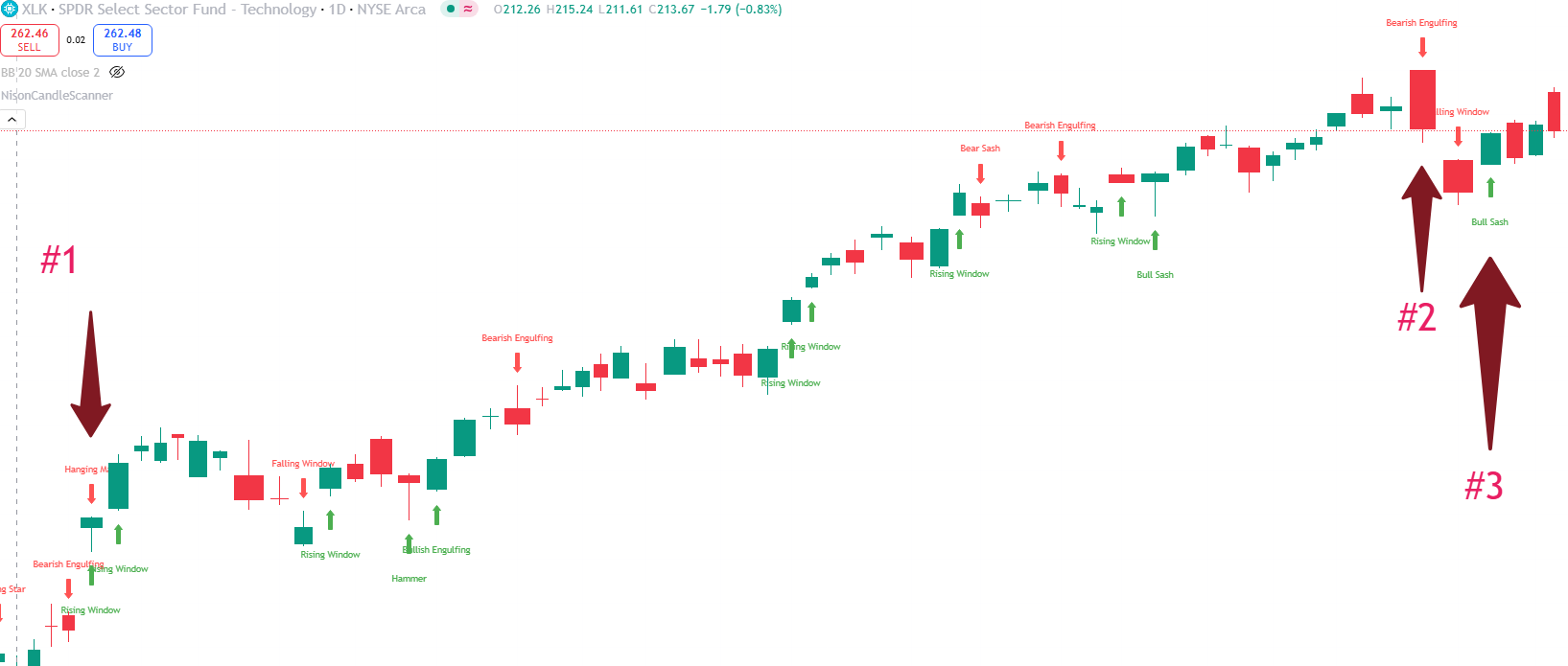 Question 2: At the point of #2, you will see a Bearish Engulfing Pattern. A bearish engulfing candlestick pattern occurs when selling pressure overwhelms buying force as reflected by a long black real body engulfing a small white real body in an uptrend.