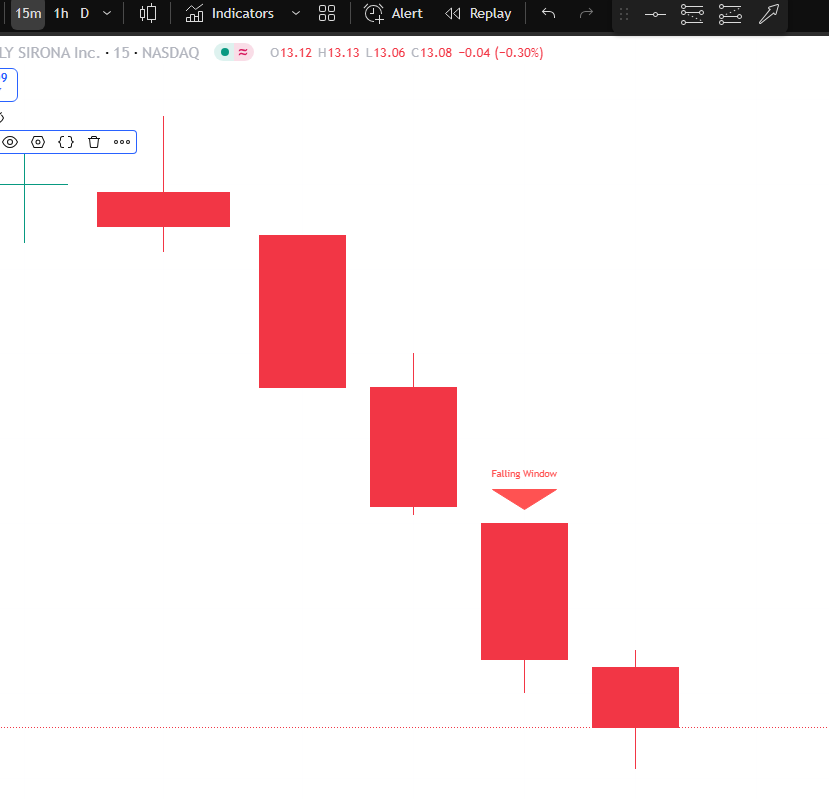 Question 4: Yes, it is certainly possible for a rising or falling window to occur on an intraday chart. Here is an example of a falling window on a 15 minute chart that occurred in the middle of a trading day. To find this, we used Nison Candle Scanner to scan markets on a 15 chart. This identified a window that was 1 cent. *Note that small windows are Steve's favorite candle pattern